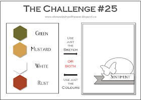 Today I will share with you the card I created for a challenge over at Always Playing with Paper Blog. The challenge was to use the color suggestions AND the sketch OR just the sketch or the color challenge. I chose to just use the sketch and here is what I came up with.