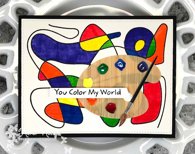 I kind of had it in my mind for it to be a "modern painting" look. I then added the paint palate onto the card front and added swatches of "paint" to the palate covered in glossy accents. The colors are bright but it was so fun to make.